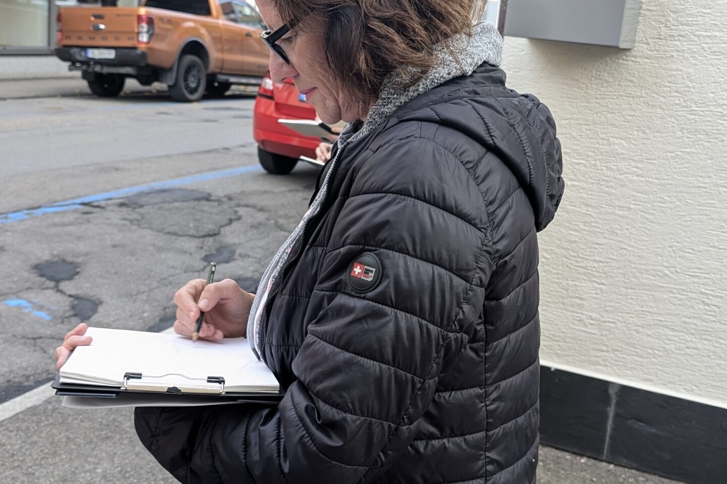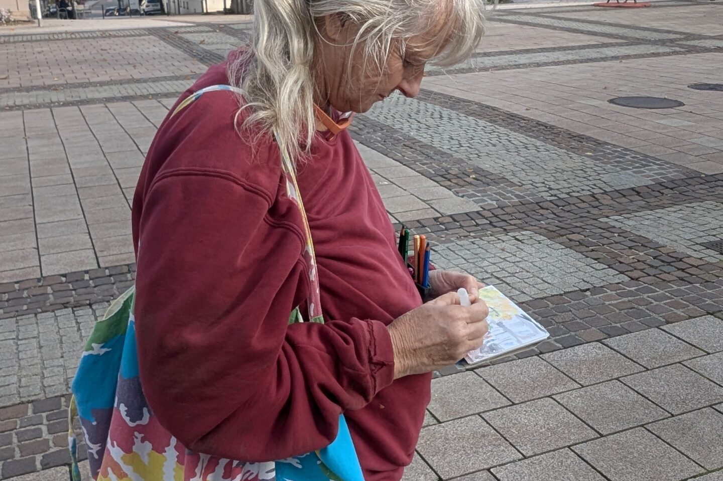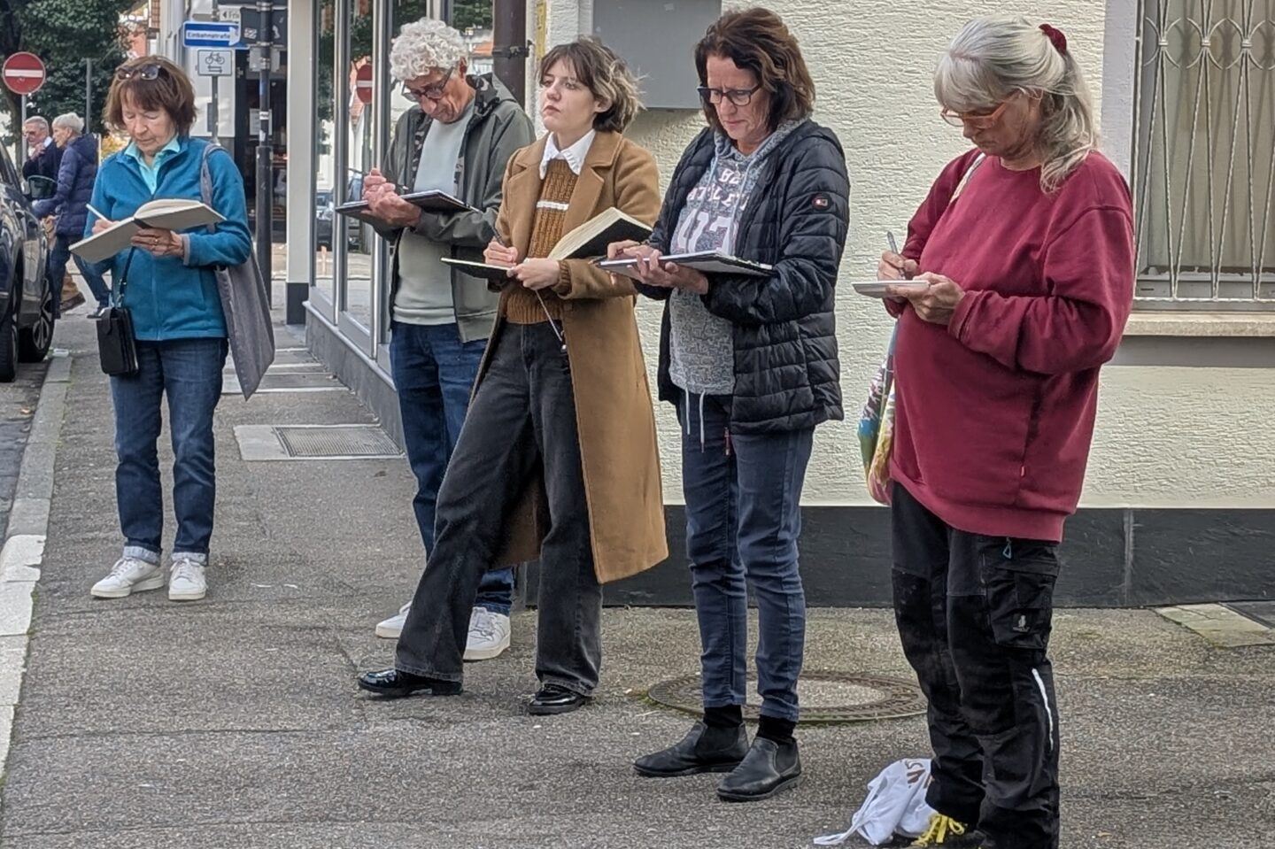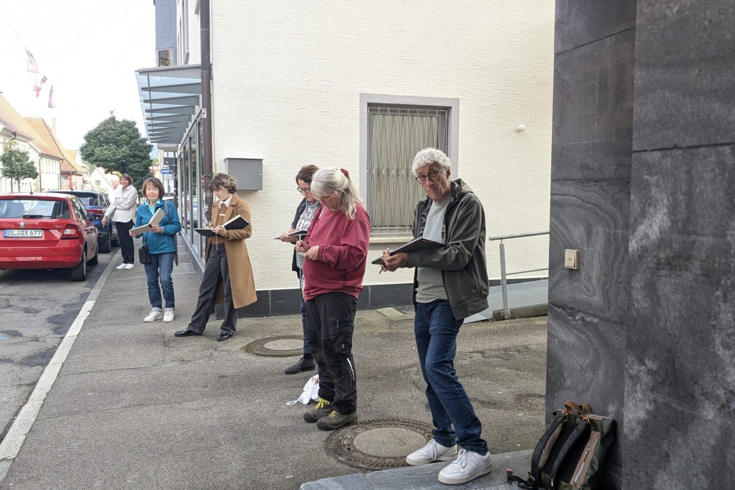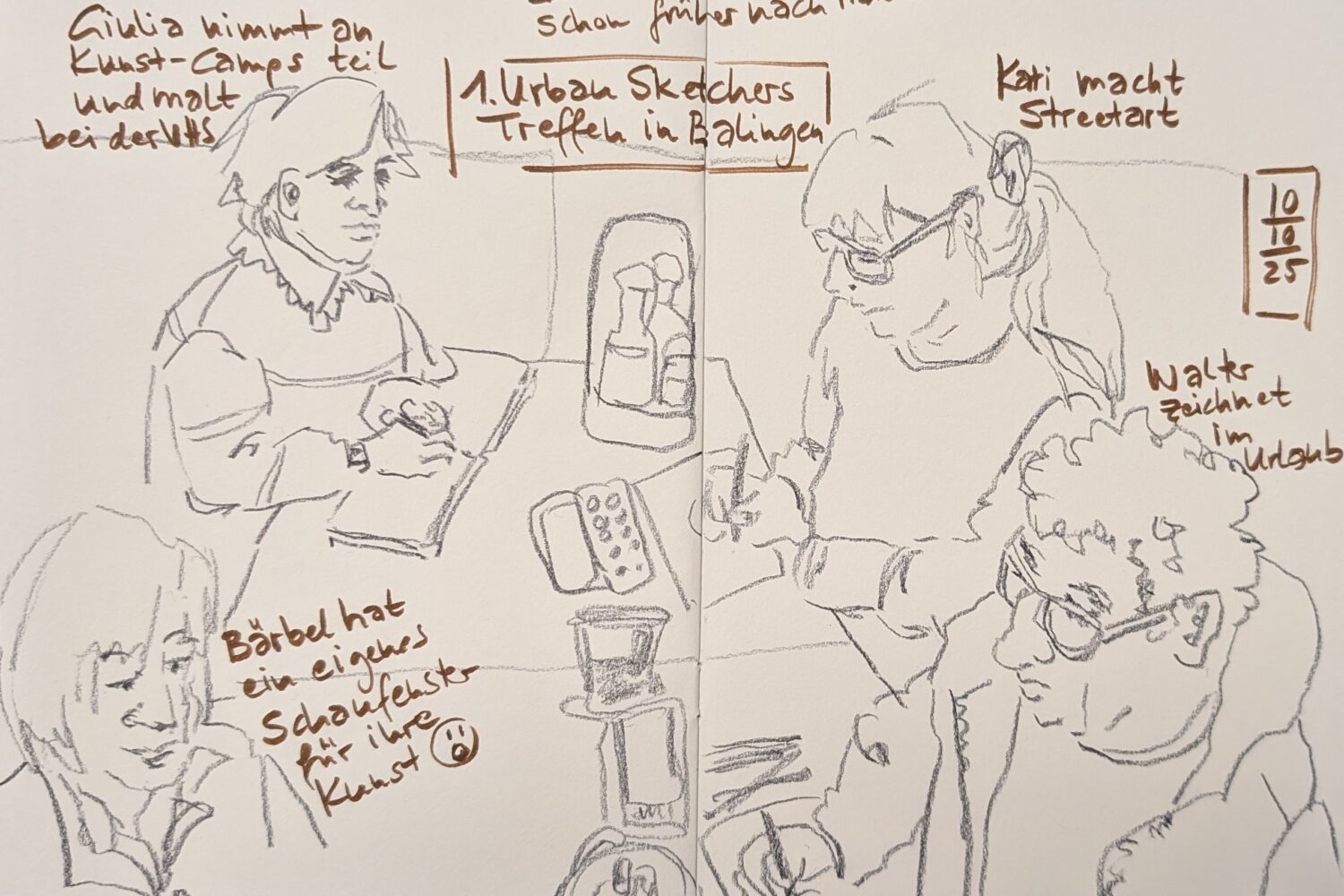 Am Freitag, 10.10.25 startete im Rahmen der Reihe „Kreative(s) Treffen“ ein neues Angebot des Vereins Freiraum – Balingen kreativ e.V.: Eine zeichnerische Entdeckungstour durch die Stadt. Fünf künstlerisch interessierte Menschen trafen sich mit Christine Fuchs, die dieses Angebot initiierte, am Brunnen auf dem Marktplatz. Die von ihr ausgesuchten drei Zeichenspots in der Innenstadt wurden jeweils für 15 bis 30 Minuten zum Ausgangspunkt für ganz individuelle Zeichnungen.