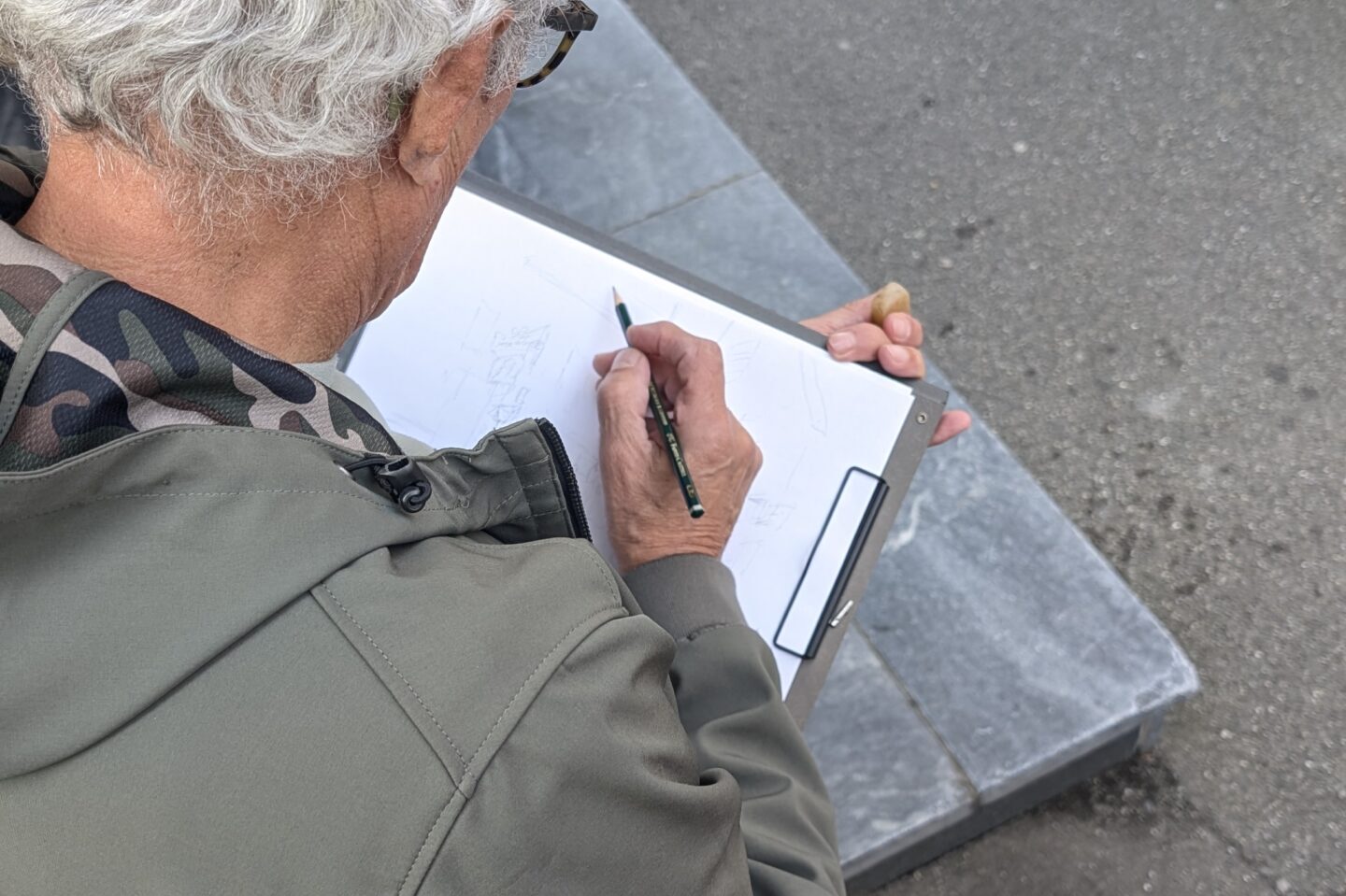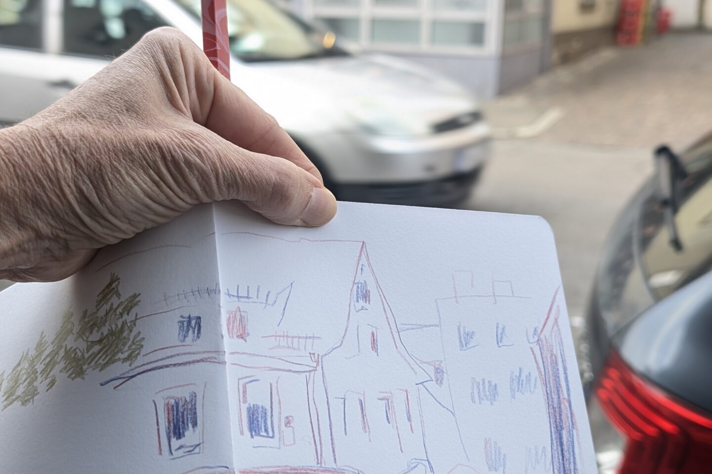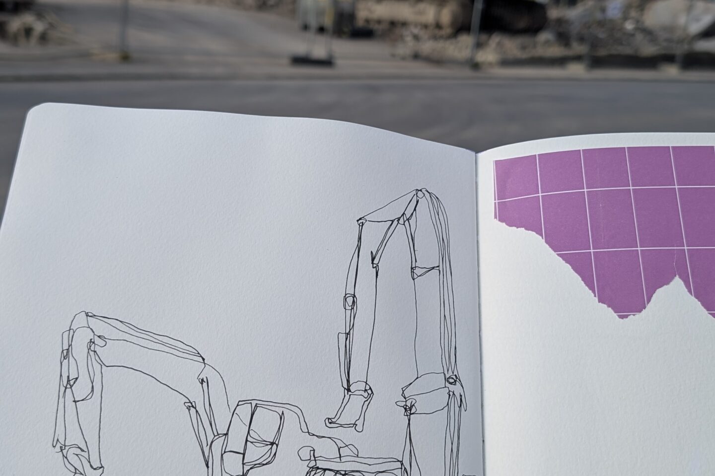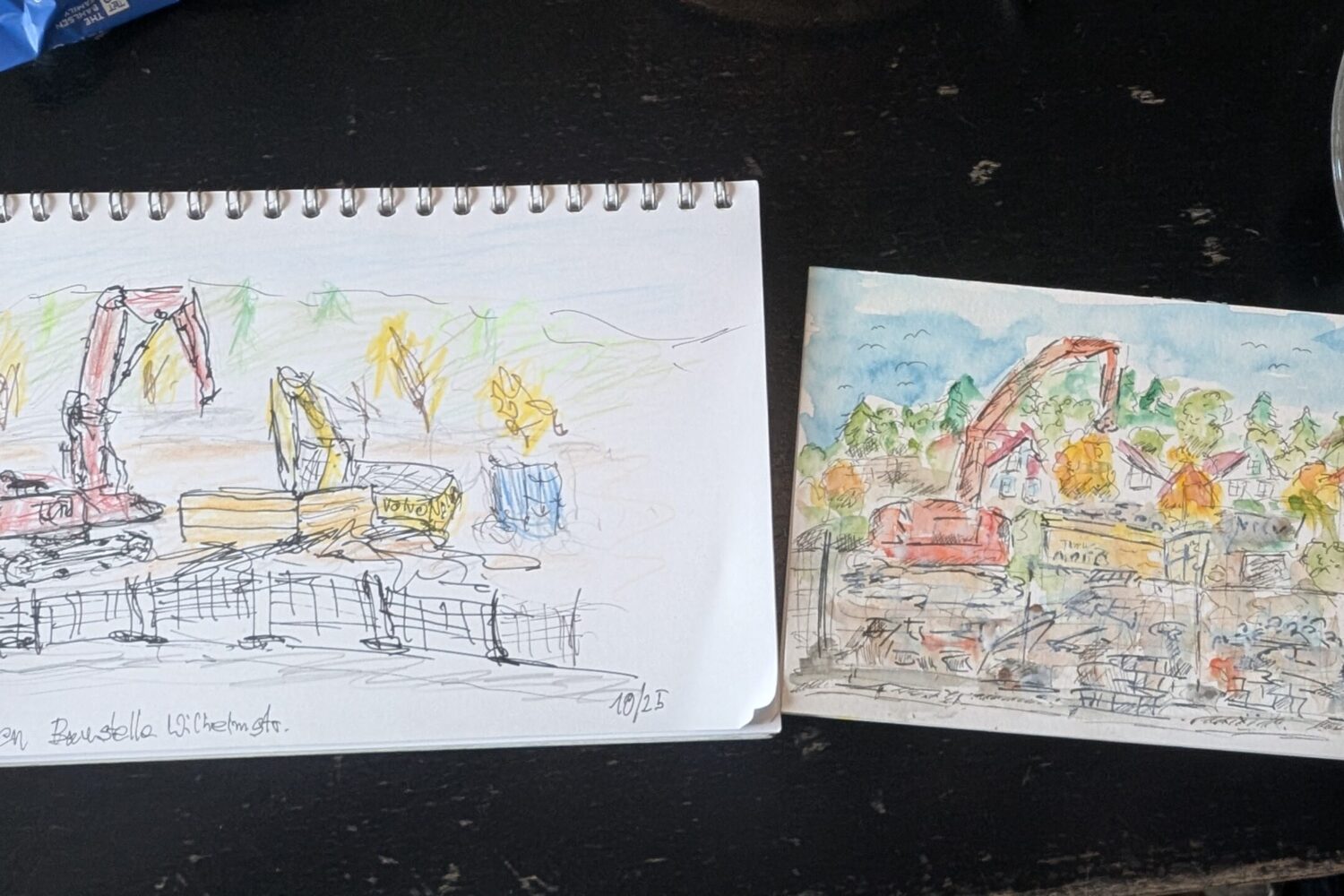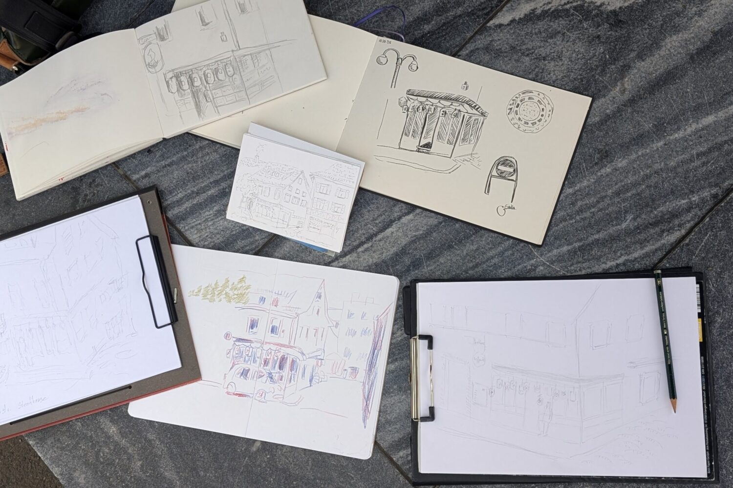 Danach ging`s zurück zum Marktplatz. Aufmerksame Besucher konnten dort quasi an jeder Ecke jemanden mit Skizzenbuch und Zeichenstift entdecken. Beim Urban Sketching werden nach jedem Halt die Skizzenbücher ausgelegt und man schaut die Zeichnungen zusammen an, tauscht sich über die entstanden Werke aus und bekommt neue Ideen für die eigene nächste Skizze. Frei nach dem Motto „everything is interesting when you draw it“ wurde die Baustelle an der Ecke Wilhelmstraße/ Am Lindle für alle fünf unerwartet zum Highlight des Nachmittags. Denn nicht nur historische Gebäude machen sich in Skizzenbüchern sehr gut, sondern auch Bagger und Bauschutt.