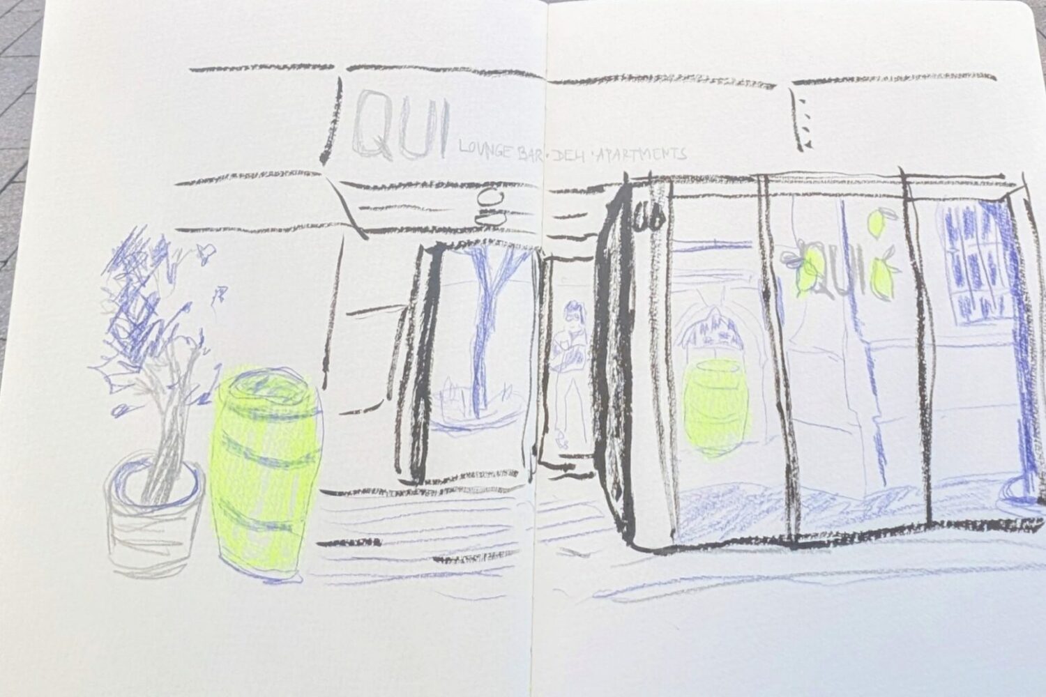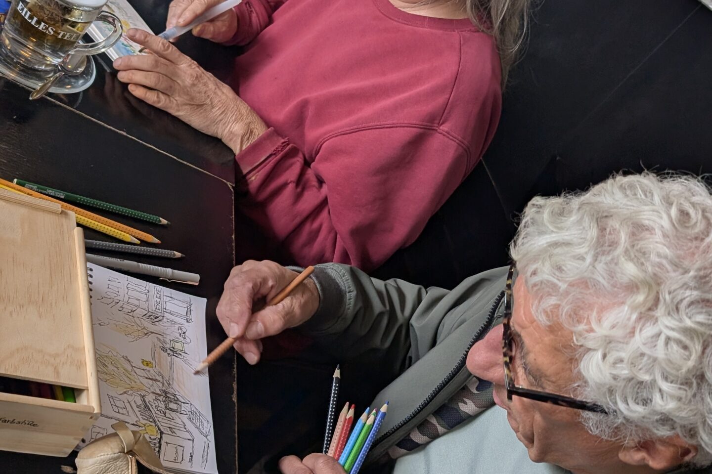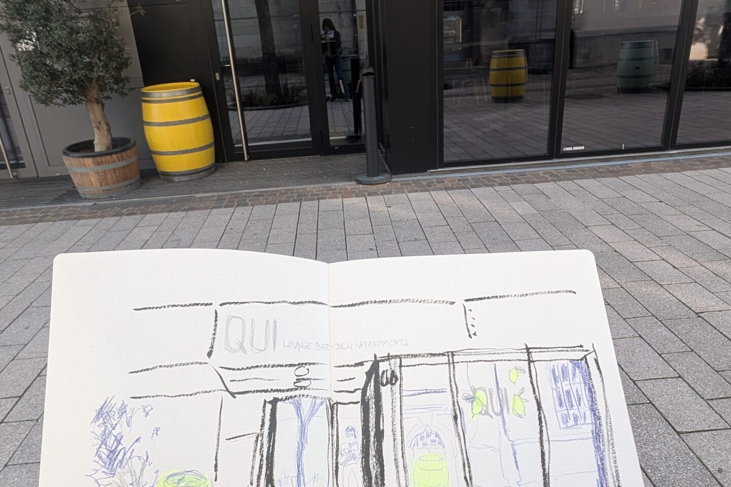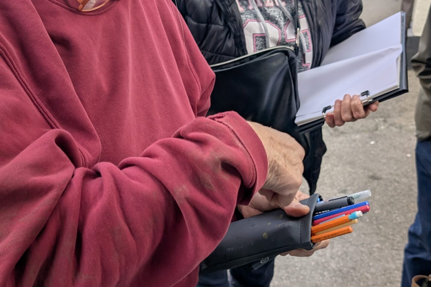 Beim Urban Sketching werden in Skizzenbüchern oft Gebäude, Straßenszenen und Menschen festgehalten. Jede und jeder nutzt dabei das eigene Lieblingsmaterial, sucht sich eine Szene aus und entscheidet frei, welche Motive gezeichnet werden. So entstanden schon am ersten Halt sechs ähnliche, aber doch verschiedene Kunstwerke zum Vor-Ort-Motiv „Asiatischer Imbiss“.